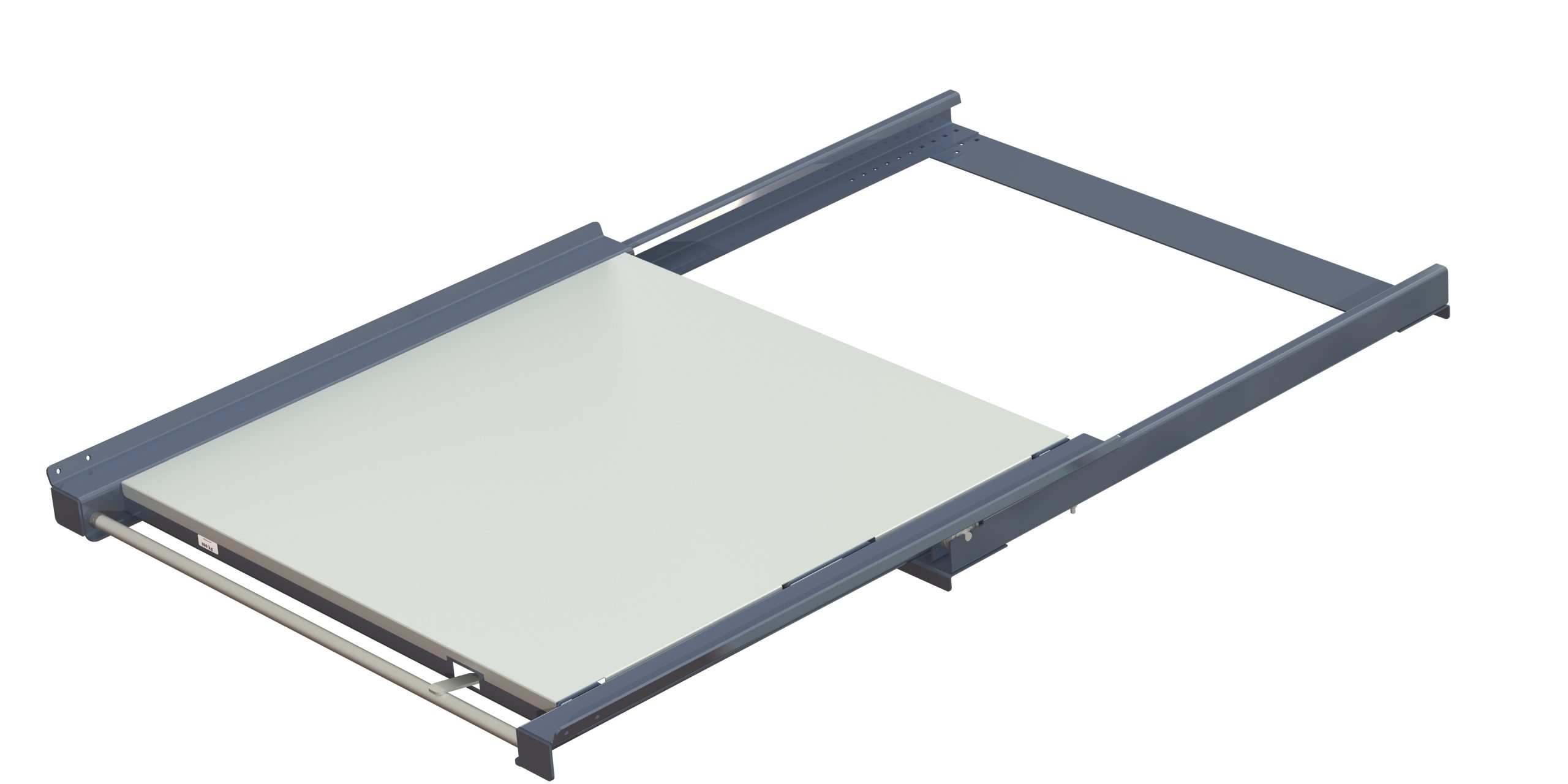 Pull-out unit for pallet rack with 70% extension, 800 kg load capacity, Front-loaded, for IND-pallet with steel shelf panel Pull-out unit for pallet rack with 70% extension, 800 kg load capacity, Front-loaded, for IND-pallet with steel shelf panel